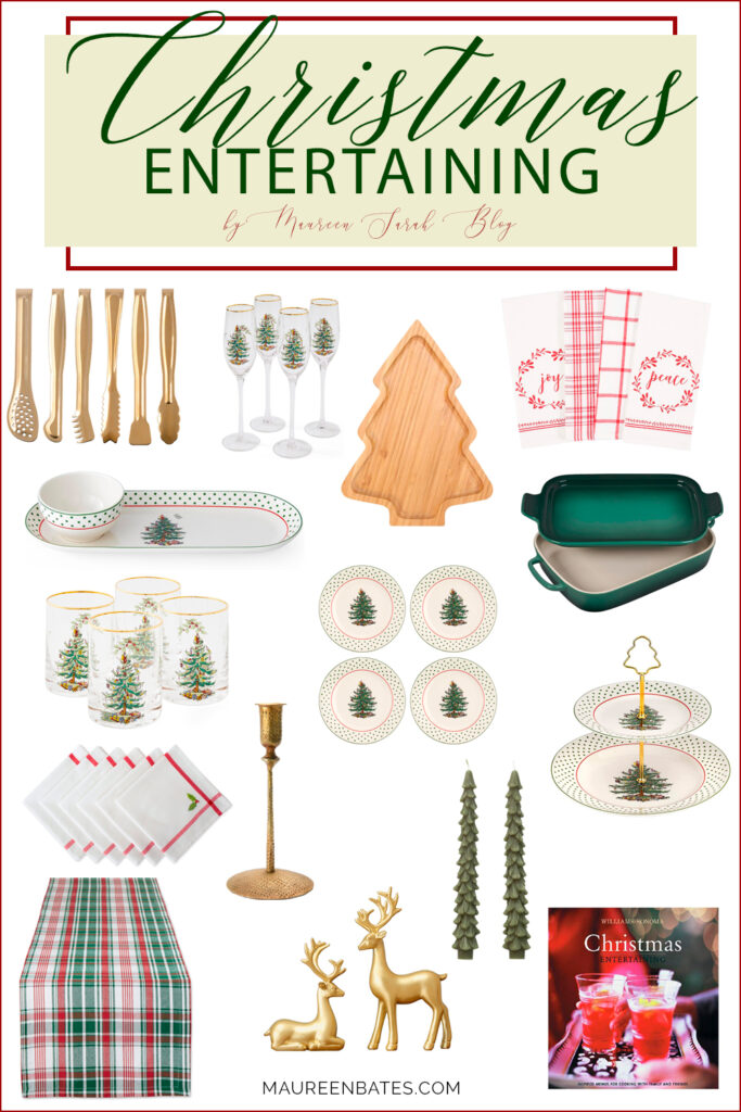 Gold Mini Serving Tongs | Christmas Tree Wine Glasses | Wooden Christmas Tree Tray | Mixed Holiday Dish Towels | Christmas Tree Polka Dot Chip and Dip Serving Set | Old Fashion Christmas Tree Glasses | Christmas Tree Dessert Plates | Le Creuset Stoneware Dish with Platter Lid | White with Red Border and Embroidered Holly Leaves Napkins | Hammered Metal Taper Candle Holder | Tree Shaped Taper Candles | Christmas Tree Tiered Tray | Plaid Christmas Table Runner | Reindeer Sculpture | Christmas Entertaining Book